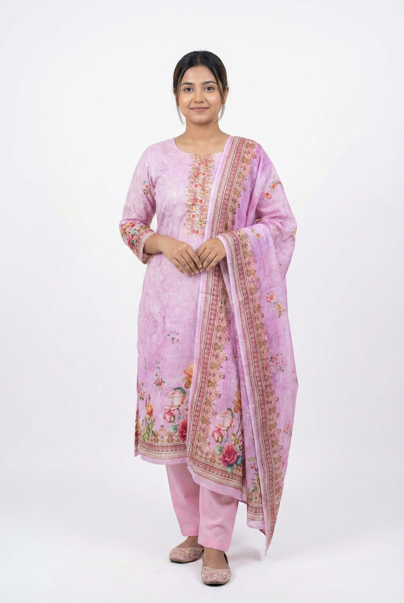 হালকা লাইল্যাক কালারের ওপর পুরো বডি জুড়ে থাকা সিকোয়েন্সের (Sequence) কাজ ড্রেসটিতে এনেছে এক স্বপ্নের মতো আভা (Dreamy vibe)। কামিজের নিচের অংশে এবং ওড়নার বর্ডারে থাকা গোলাপের প্রিন্ট ডিজাইনটি খুব সুন্দরভাবে ফুটে উঠেছে। নেকলাইনে থাকা ডিটেইলড প্রিন্ট অনেকটা এমব্রয়ডারির মতো লুক দেয়।